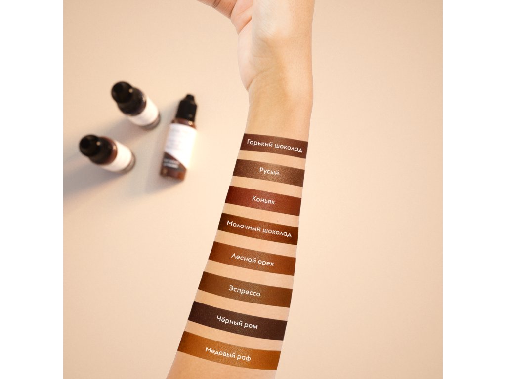 Krásný v mixu s „Lískovým ořechem č.1,“ nebo „Rusým č 4“. Lze použit k překrytí starého zeleného a šedozeleného tetování. Skvělá volba pro vytvoření hlubokých hnědých stínů na očních víčkách.